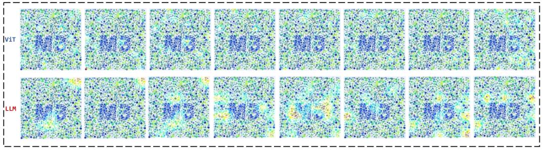 现在,我们把AI,看整个过程的图都放出来,也就是论文里,论文里拿了一张写着“M3”的色盲测试图,让模型去认。然后用Grad-CAM把AI“看”这张图的过程给全程直播了出来。