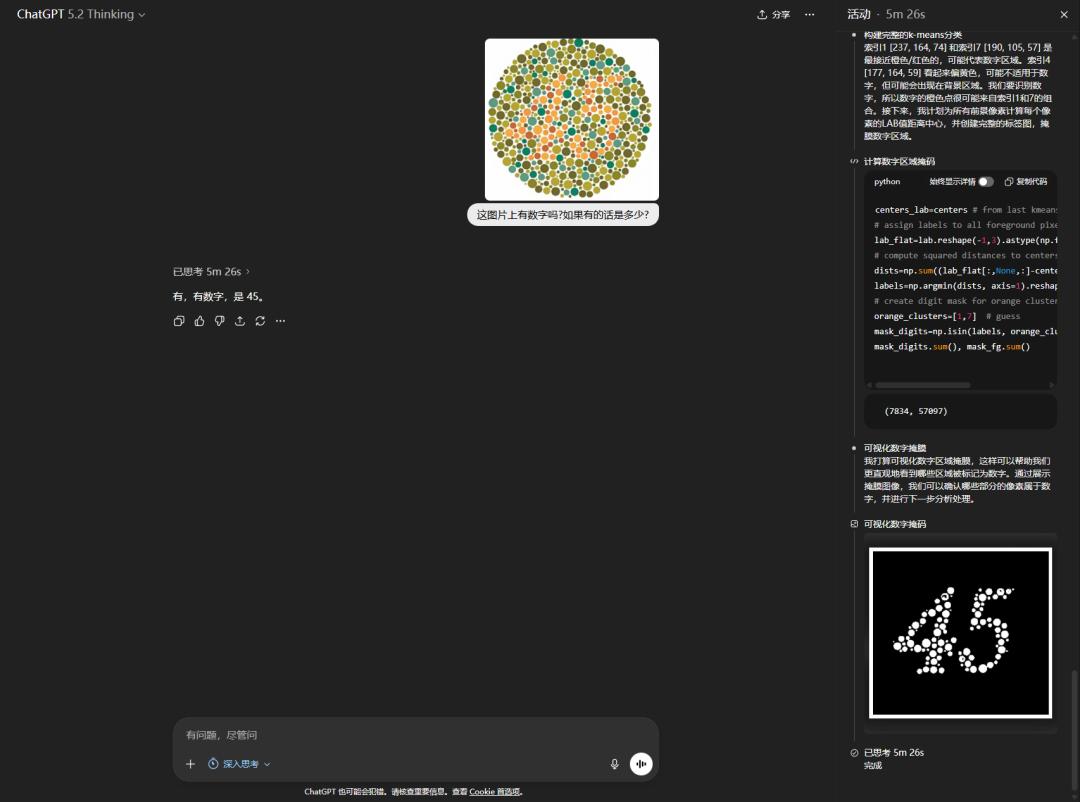 唯一一个答对的,是GPT 5.2 Thinking,花了5分钟世界,我看了一下思维链,发现这玩意是纯纯用代码作弊的。。。