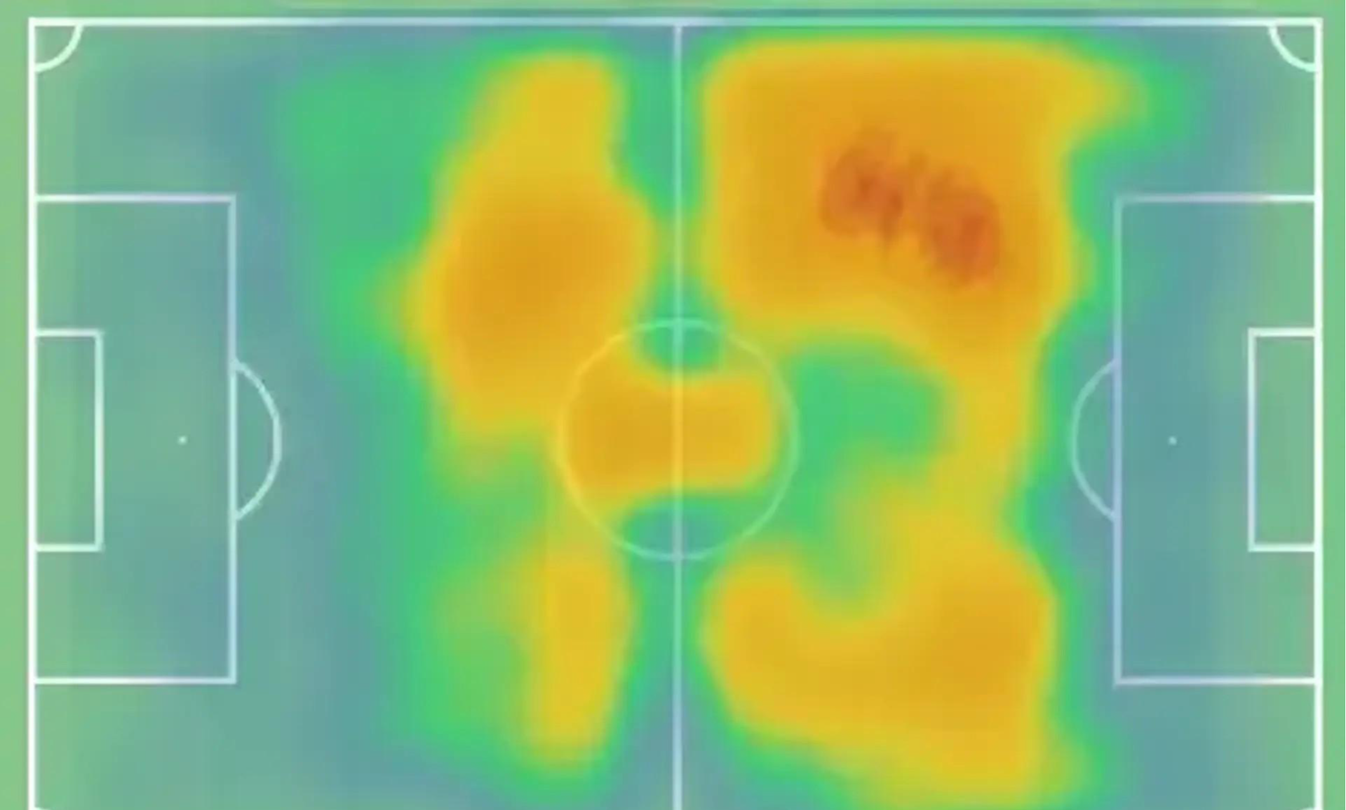 差异很简单:以前在进攻中,曼联队长在约80-90%的情况下踢得非常靠前;现在这个比例已大幅下降。例如,2024/25赛季的热点图显示,活动最热的区域在对方半场。