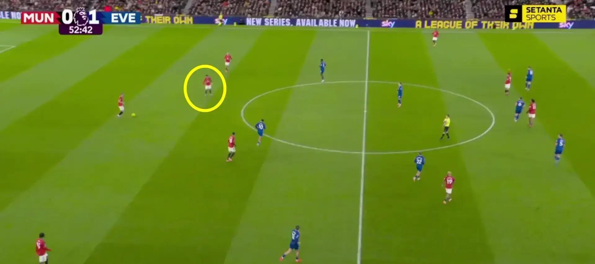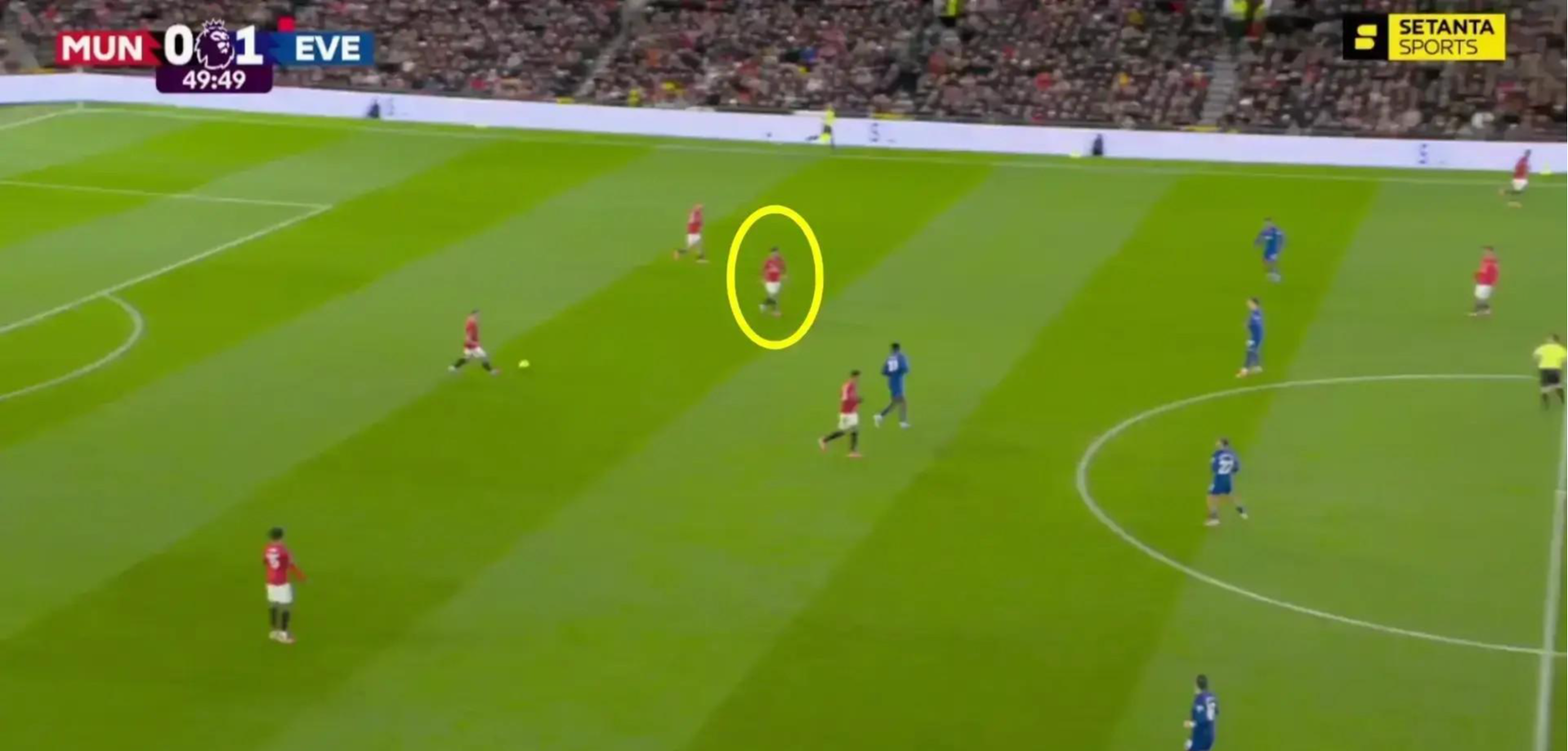 葡萄牙人反驳说,阿莫林要求他和梅努在这个角色上积极参与进攻——所以他们经常出现在进攻三区。这不是一个纯粹的"八号",更像是"八/十号",附近有"六号"/"八号"搭档(卡塞米罗或乌加特)。