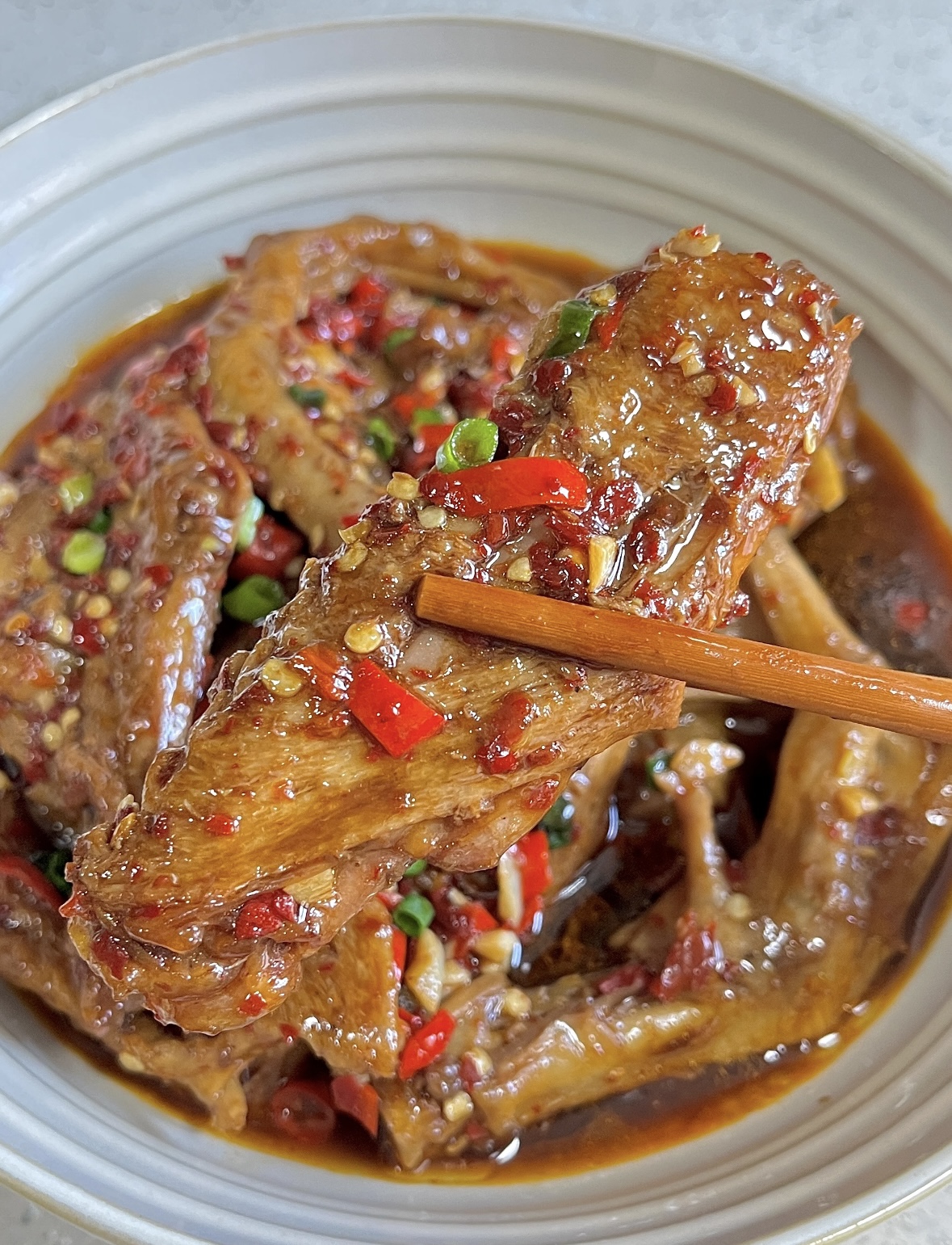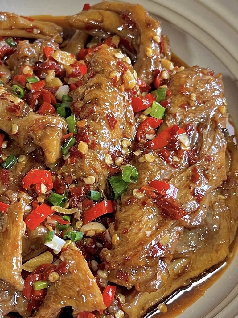 8分钟一到,关火,等气阀“噗噗”冒完,开盖——哇,厨房瞬间变身卤味铺子,香味直冲脑门。别急着吃,现在只是“半成品”,真正让鸭货“封神”的,是后面那口炒锅里的小火爆炒。锅里倒两勺刚才的卤汤,再补一点油,小火下蒜蓉和小米辣,“滋啦”一声,蒜香和辣味一起蹦迪。接着把鸭货们请进去,转中火,让每一寸皮肤都裹上辣椒粉的“红被子”。关键来了:加两勺生抽、一小勺白糖,白糖不是增甜,是让辣味更圆润,就像给辣妹子加了层滤镜,瞬间温柔。大火收汁,汤汁咕嘟咕嘟冒泡,慢慢变得黏稠,鸭爪鸭翅表面泛起一层亮晶晶的“玻璃芡”,这时候关火,淋半勺香油,撒一把葱花,翻匀出锅。