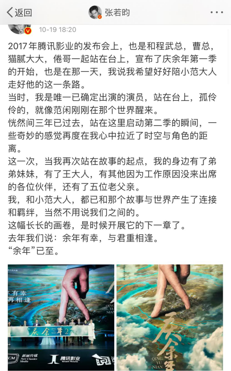 发布会结束后,张若昀发布微博表示:三年前自己是一个人站在这里,现在身边有了弟弟妹妹,有了王大人,有其他因为工作原因没来出席的各位伙伴,还有了五位老父亲。去年我们说:余年有幸,与君重相逢。“余年”已至。