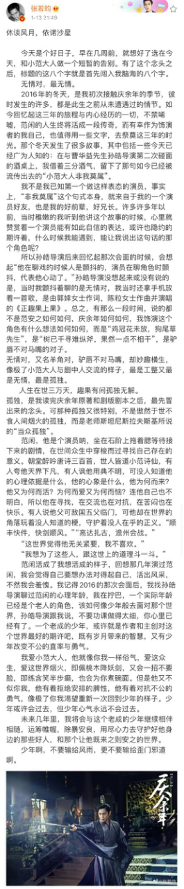 2019年末,《庆余年》播出即爆款,收官之夜张若昀微博发长文告别范闲,他说“少年或许会过去,但少年心气永远不会过去”