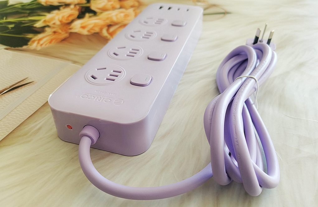 奥睿科分控小胖条插座采用了经典的四色设计,紫色、蓝色、白色、黑色,满足不同的用户需求群体。整个插排的设计尺寸为239*72*30mm,插座正面设有4组插孔,每个插孔支持三口或两口插头,带有儿童安全防护门,插入电器插头时需要稍微用力。