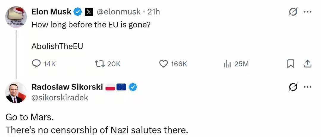 欧盟内部则迅速凝聚反击共识,波兰外长西科尔斯基的回应最为尖锐。他在社交平台直接回怼马斯克:“滚去火星吧。那里没有对纳粹问候语的审查。”