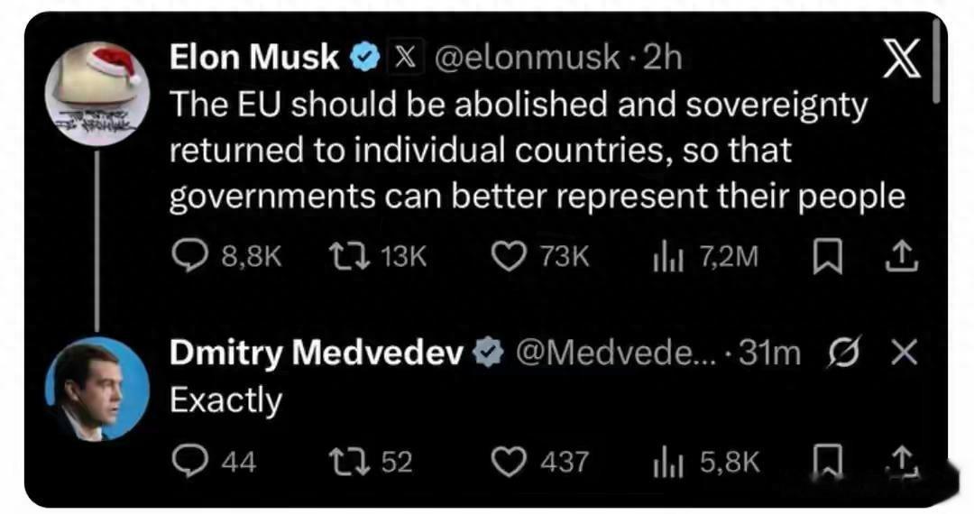 面对天价罚单,马斯克选择以强硬姿态将矛盾升级。他在X平台公开叫板:“欧盟应当被解散,主权应归还给各个国家,这样各国政府才能更好地代表本国人民的利益。”随后更进一步抛出挑衅性追问“欧盟还剩多少时间就会消失”,将企业与监管机构的商业纠纷,直接转化为对区域一体化组织合法性的质疑。