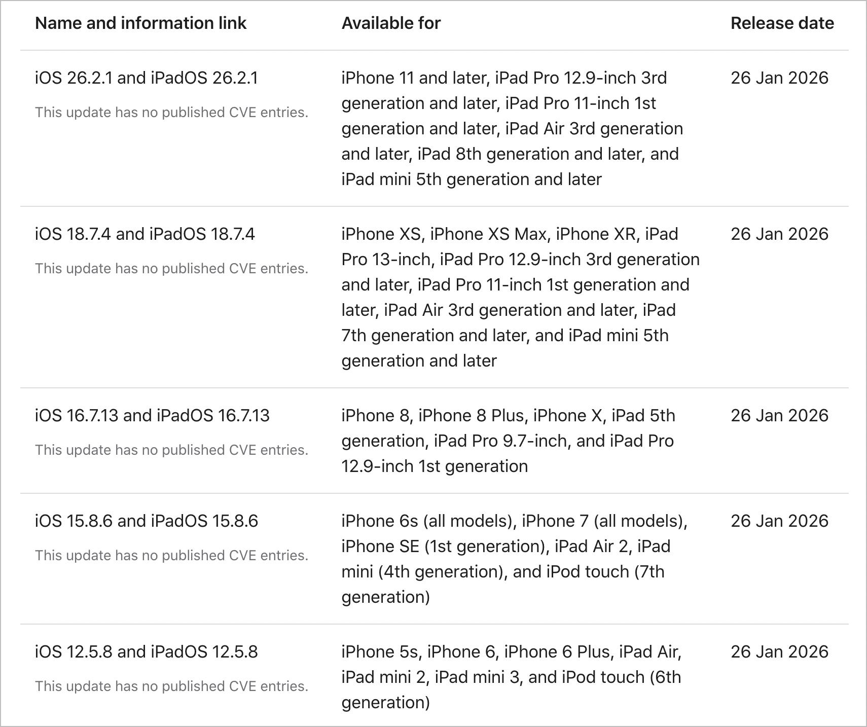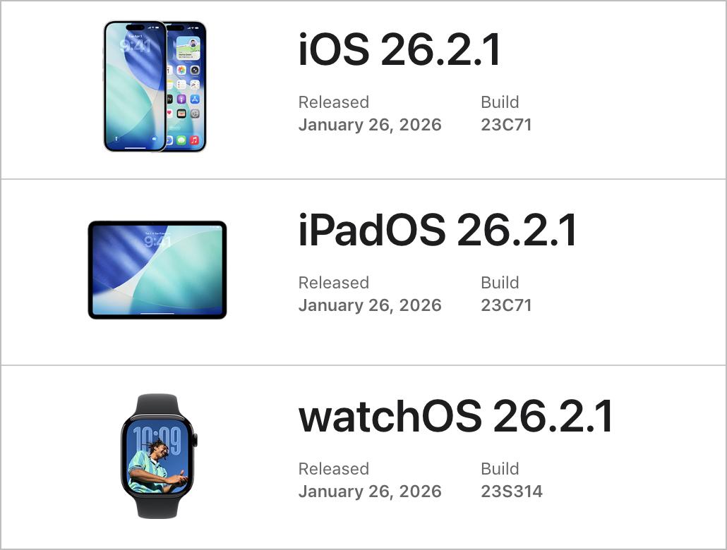 距离上一个 iOS 26.2 正式版已经过去 45 天,苹果在今天(1 月 27 日)凌晨终于推送了新一轮系统更新,包括 iOS 26.2.1、iPadOS 26.2.1 以及 watchOS 26.2.1。与此同时,苹果也为多款老机型发布了对应的维护版本。
