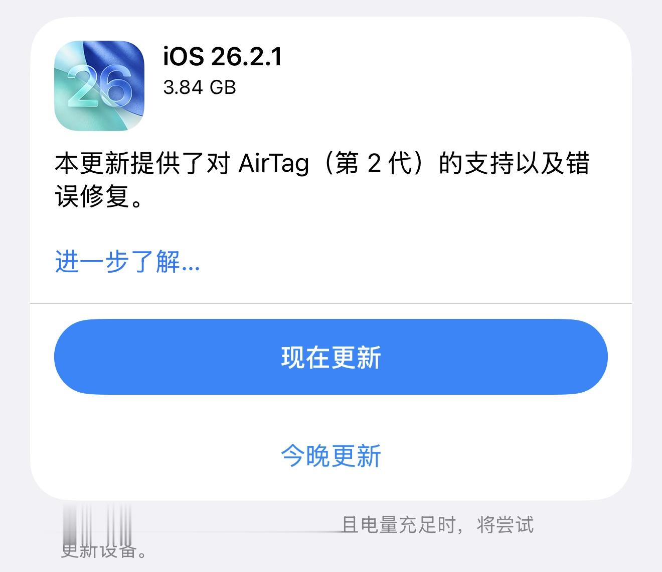 iOS 26.2.1 作为一次小版本更新,iOS 26.2.1 在界面和功能层面几乎没有可感知的变化。这次更新的核心目的,是为昨天刚发布的第二代 AirTag 提供系统支持。