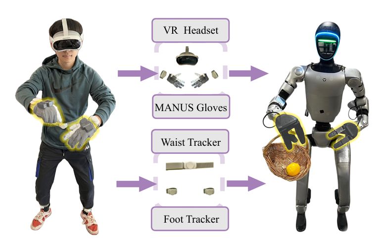 南加州大学物理超智能(PSI)实验室建立了一个单操作者全身远程操作框架,该框架有意地分离了三种控制流:上身姿态跟踪、灵巧手控制和局部运动命令。每个流都由专用的感测模态来处理。