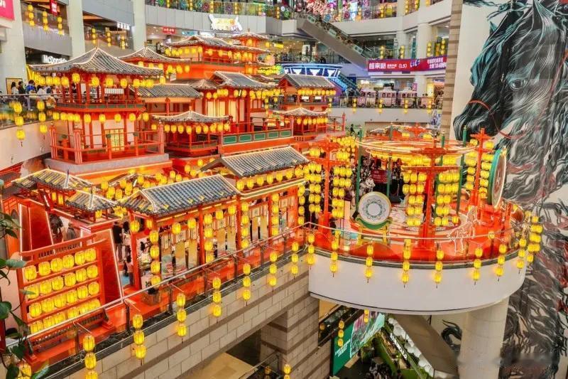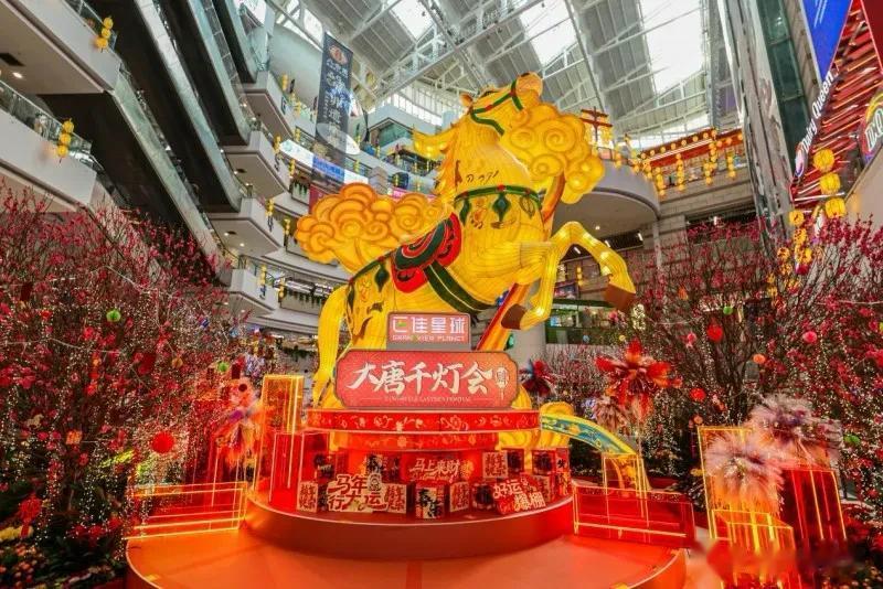本届千灯会以“玄奘归唐”为叙事线索,匠心打造四大花灯盛景,千盏花灯勾勒出一幅绝美盛唐画卷,马年主题花灯成为点睛之笔。户外北广场,30 米“山海奇骏”灯组气势恢宏,骏马踏浪的造型与音乐喷泉水舞秀相映成趣,寓意新春启程顺遂;西北门“华灯初上”长廊,红灯笼绵延不绝,红影摇曳,营造出浓厚的盛唐入城仪式感,让游客仿若瞬间穿越千年;一楼中庭,10米高的“云腾逐梦”天马灯成为全场视觉焦点,鎏金祥云为鬃、唐三彩为羽,屹立于桃林之间,传递着吉祥如意的新春祝福,成为游客打卡留念的必到之处;四楼中庭 “盛世唐城”以大明宫为蓝本,融合青龙寺禅意与莫高窟彩绘,花灯点缀的殿宇廊桥一步一景,让人仿若置身盛唐元夕夜,感受千年前的繁华与浪漫。