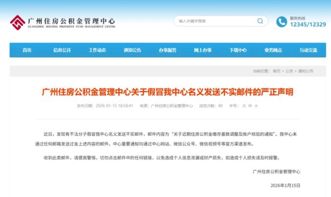 1月15日,记者从广州住房公积金管理中心获悉,近日,发现有不法分子假冒该中心名义发送不实邮件,邮件内容为“关于近期住房公积金缴存基数调整及账户核验的通知”。该信息已经证实为不实。