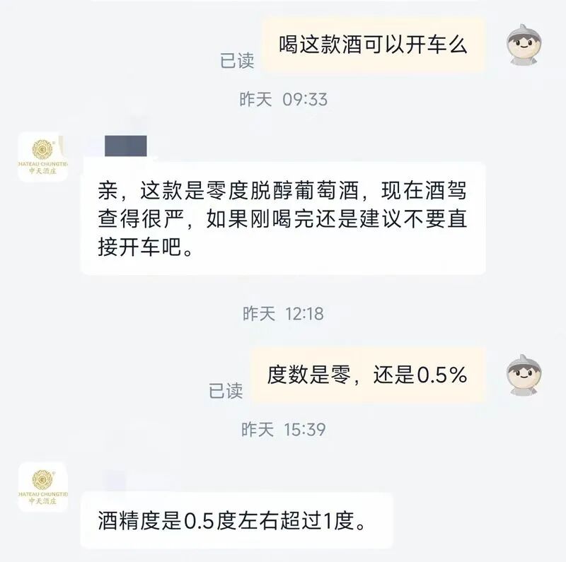 据客服介绍,“这款零度脱醇葡萄酒在生产过程中把酒中的酒精脱醇出来,酒精度只有不到1度,口感还是保留葡萄酒原有的风味,酸甜适中”。然而有买家留言反馈,该产品口感发酸,味道一般,没有酒味,更像是果汁的味道,类似酸梅汁。对于饮用后能否开车,客服依然称其产品为零度脱醇葡萄酒,并称“现在酒驾查得很严,如果刚喝完还是不建议直接开车”。