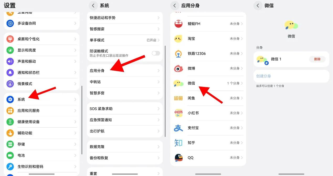 不少人春节还会遇到一个现实问题:工作微信和生活微信两个账号需要反复切换,怎么都不清净。在鸿蒙手机上,通过【设置-系统—应用分身—微信—创建分身】,桌面立刻多一个微信图标。这样就能实现微信双开,一个用来抢红包、回祝福,一个安安静静处理工作,互不打扰,春节也能有点边界感。