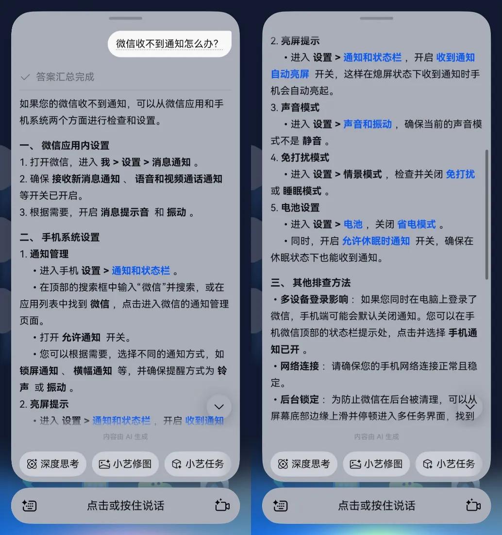 如果遇到“明明有人找我,手机却不响”的情况,也别急着重装微信,直接问小艺一句:“微信收不到通知怎么办?”它会把微信里的通知开关、系统里的通知管理、免打扰、电池设置等可能影响消息提醒的地方一项项列出来,点击蓝字还能直达设置页面,对着检查一遍,基本都能解决。