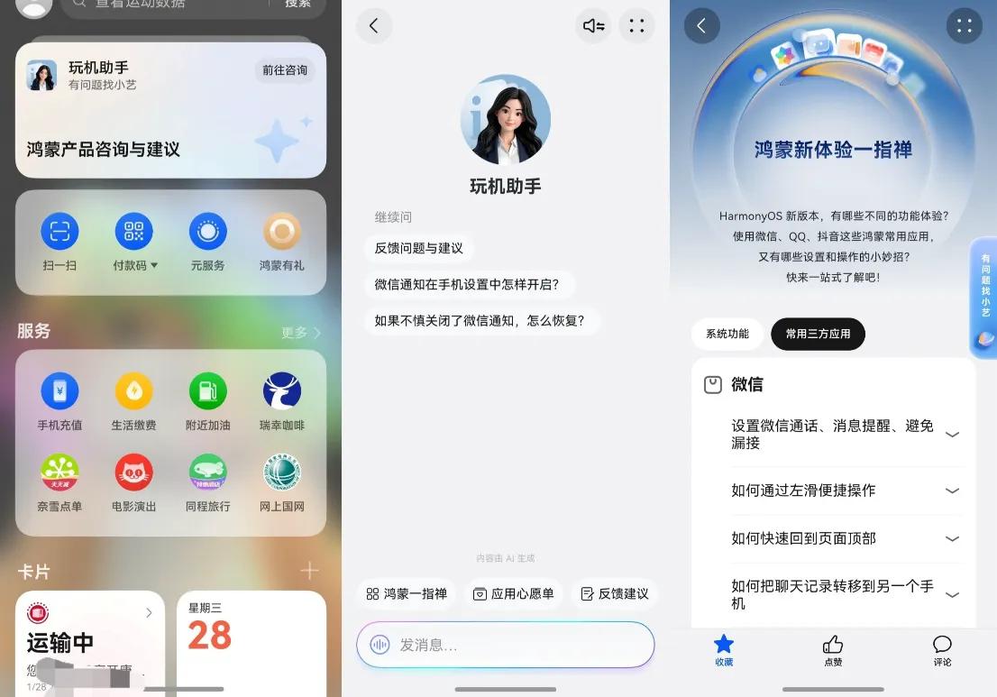 平时记不住这些操作也没关系。桌面右滑进负一屏,点顶部的“鸿蒙产品咨询与建议”,进入“玩机助手”,有啥问题都可以直接问;下面的“鸿蒙一指禅”,在“常用三方应用”里也能快速查到鸿蒙版微信的常见用法。
