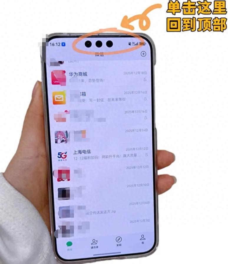 春节消息一多,最怕的就是刚划半天,突然需要看上面的的某条消息,又得慢慢往上划。在鸿蒙版微信里不用费劲儿,单击前置摄像头,或者点一下微信顶部状态栏,就能秒回聊天列表顶部,找重要消息特别省心。