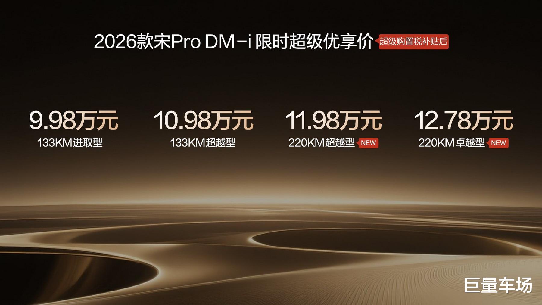 2026年1月10日,比亚迪正式宣布2026款宋Pro DM-i上新220km长续航版本,全系限时超级优享价9.98-12.78万元。