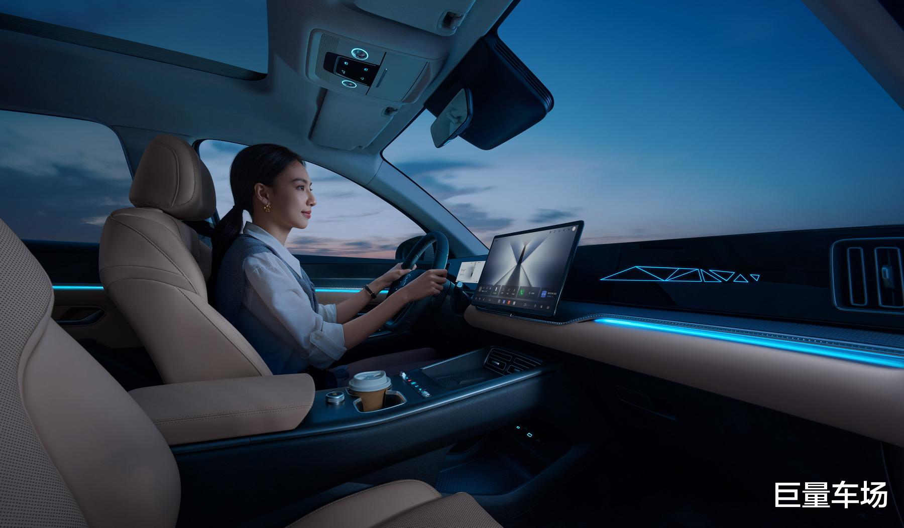 座舱内的智能化体验同样丰富。新增的一体式智能冷暖冰箱、前排座椅通风加热、感触式广角全景天窗、31 色环抱式情景氛围灯,结合15.6寸中控Pad与沉浸式音乐厅级音响,共同营造出高品质的舒适氛围。整车支持OTA远程升级,确保这些智能舒适体验常用常新。