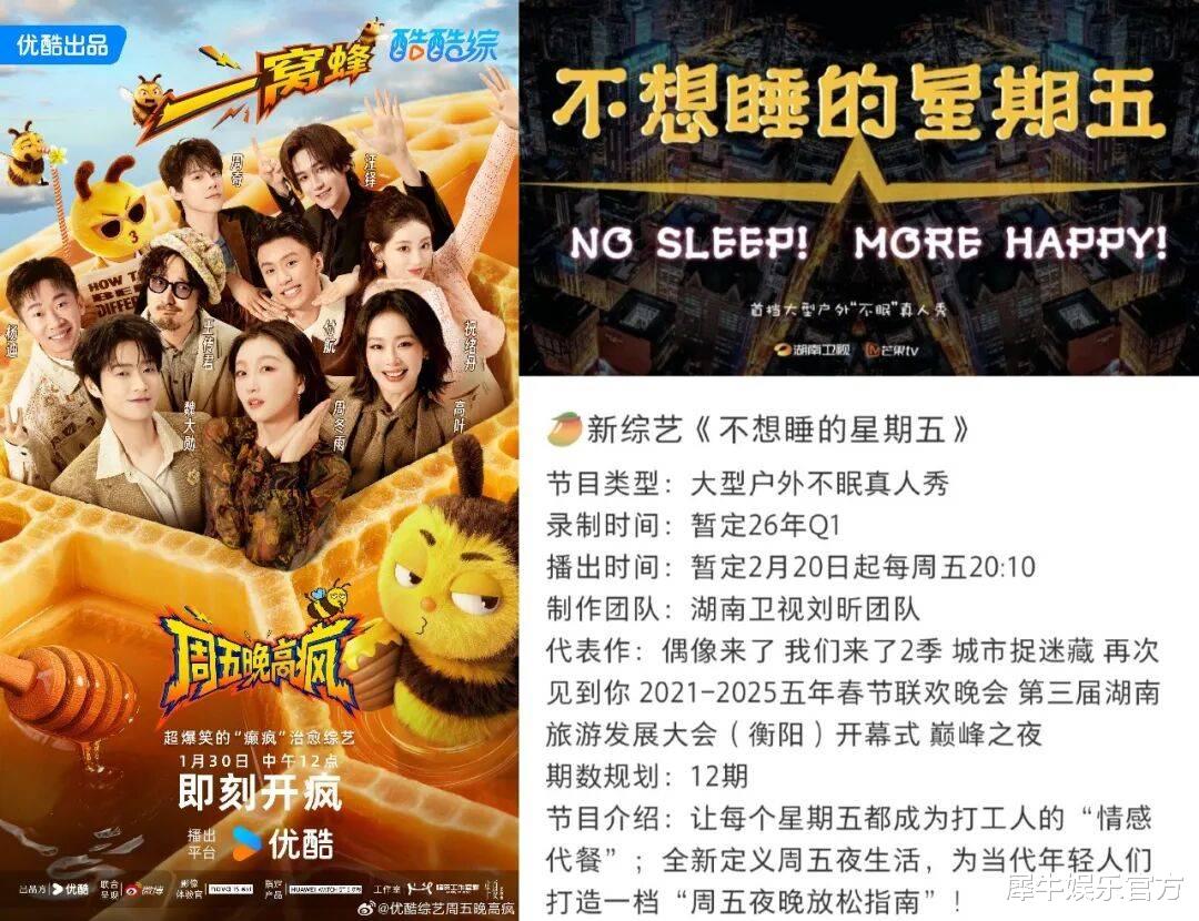 这不,最近长视频平台又齐刷刷盯上一个看似刁钻、实则很有性价比的新赛道——“周五定制发疯综艺”。前有优酷开年主推的《周五晚高疯》携周冬雨、高叶、付航、魏大勋等话题艺人齐聚周五合理发疯,后有芒果台被传正在筹备的《不想睡的星期五》拟邀何炅、闫妮、王嘉尔、章若楠、成毅、沈佳润等共赴一场周五夜未眠的放松轰趴。