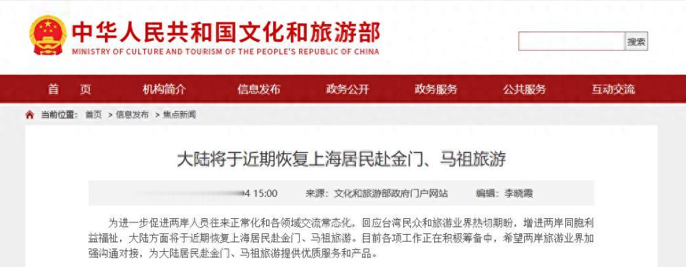 为进一步促进两岸人员往来正常化和各领域交流常态化,回应台湾民众和旅游业界热切期盼,增进两岸同胞利益福祉,大陆方面将于近期恢复上海居民赴金门、马祖旅游。目前各项工作正在积极筹备中,希望两岸旅游业界加强沟通对接,为大陆居民赴金门、马祖旅游提供优质服务和产品。