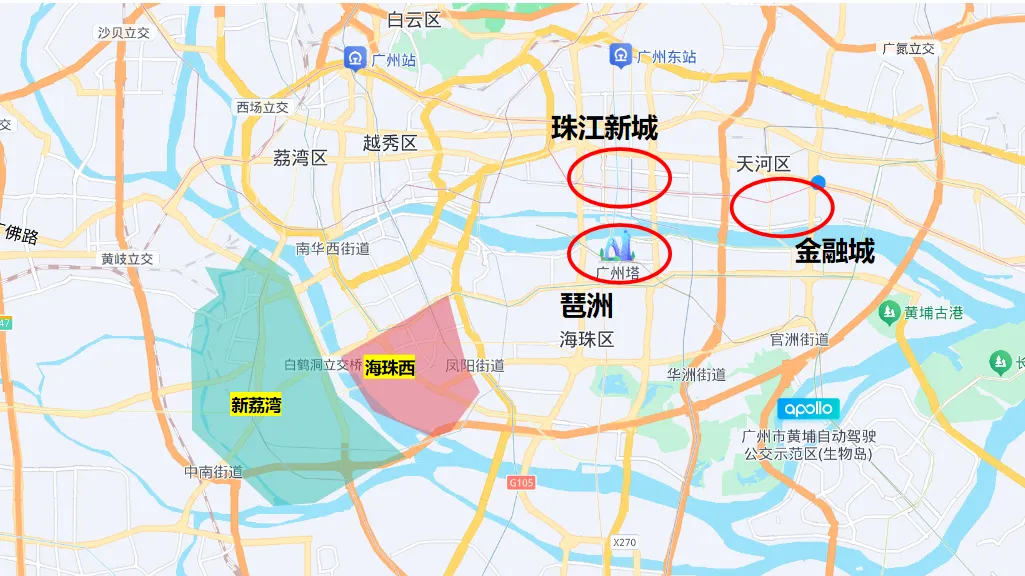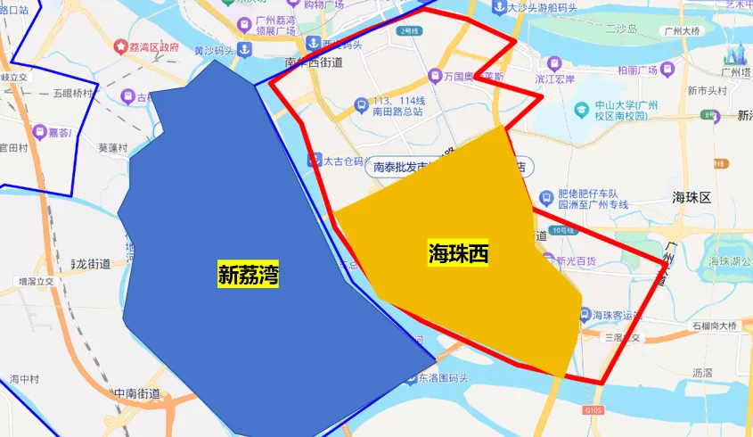 从位置来看,海珠西靠珠金琶更近,而新荔湾则更偏西,靠近佛山。