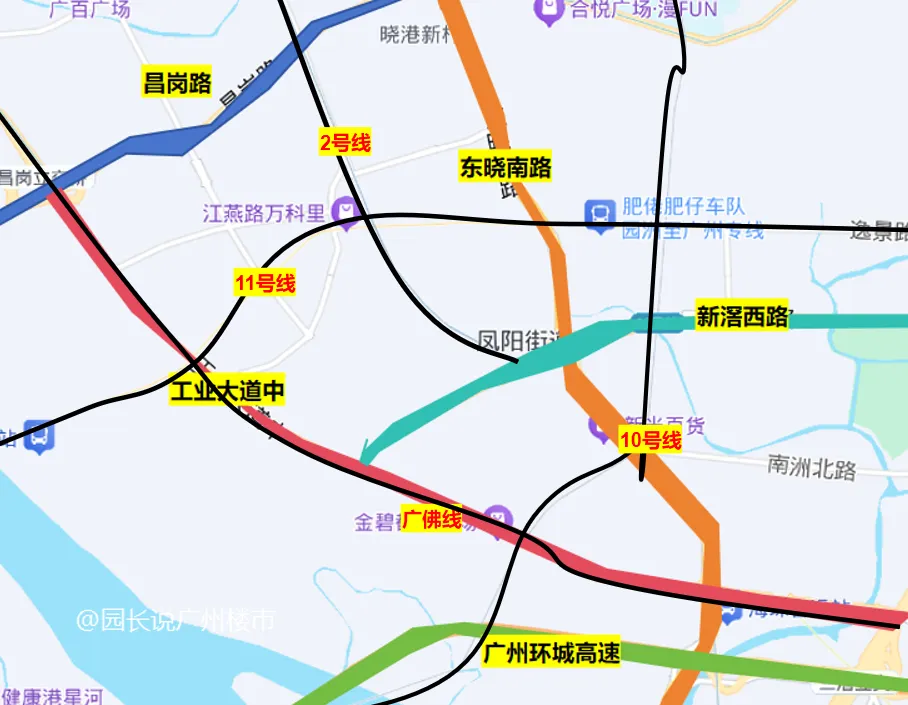昌岗路贯穿荔湾、海珠沿江区域;工业大道贯穿老荔湾及番禺;东晓南路向北是越秀,南是番禺;新滘西路联通海珠内部;环城高速可覆盖广州中心区