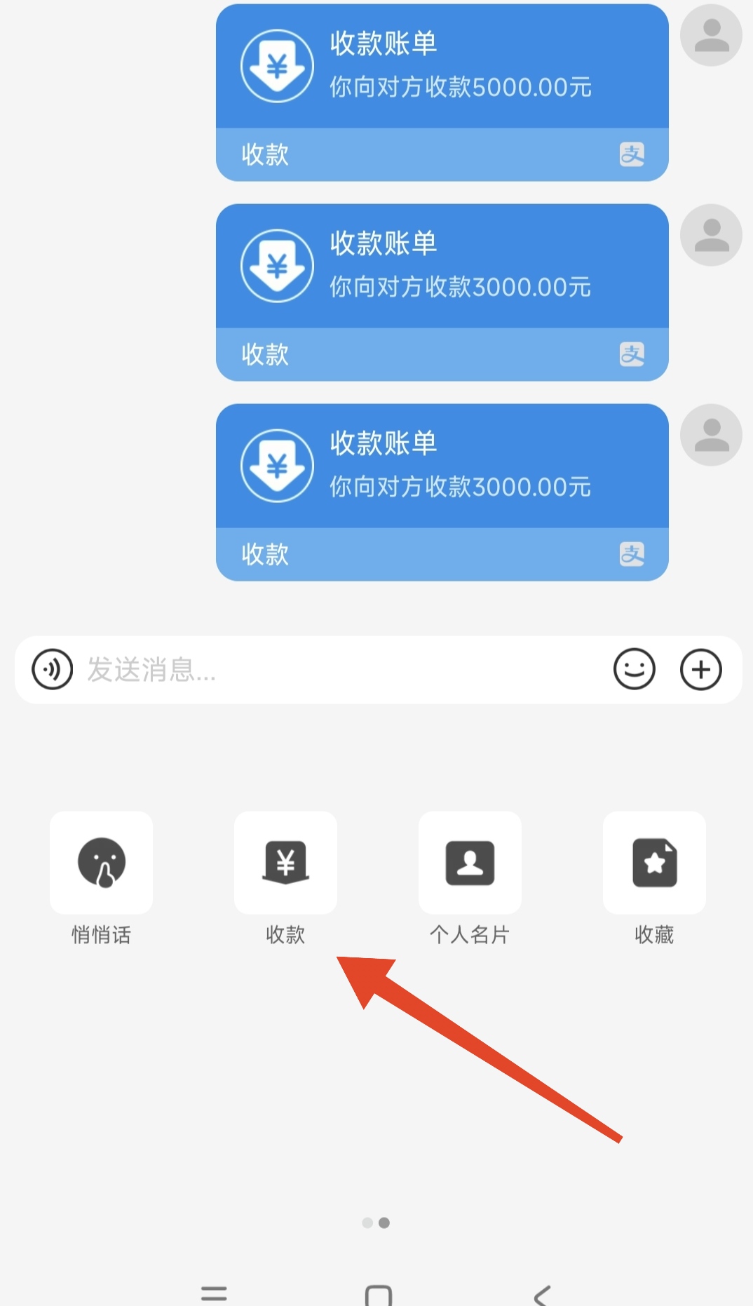 收款位置参考下图。支负宝大号和小号加上好友以后,在给好友发送消息的页面,先用小号给支付宝大号发3个收款3000的消息,大号点击消息直接用中行的卡付款就行。