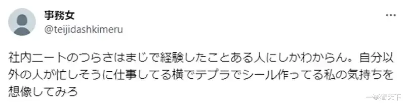 一位昵称为"事务女" 的日本推特用户分享道,自从两年前转职到新公司后,便不幸成为了一名"公司内尼特族"。