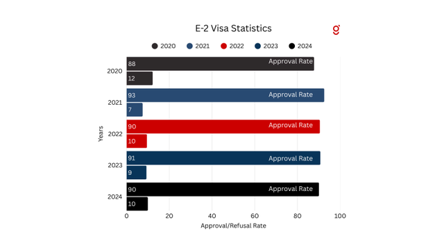 E2签证统计数据2020年至2024年间,E2签证签发数量稳步上升,从23,493份增至55,324份。这表明投资者对该项目本身的兴趣呈显著上升趋势。