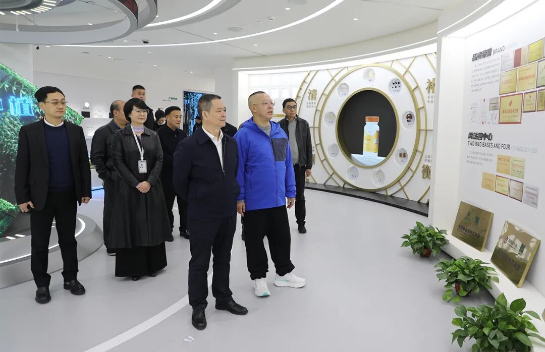 调研组先后参观了绿之韵中心数智化科技展厅。展厅以“水之道”为企业文化内核,融合东方哲学与数字技术,通过数字化互动技术和智慧展陈手段,立体呈现了绿之韵集团的企业文化、发展历程、党建公益、产品理念、科研实力及战略愿景。胡国安董事长结合展示内容向调研组介绍了企业在产品研发与产业拓展方面的创新实践,展现了绿之韵在大健康领域的持续探索与成果。