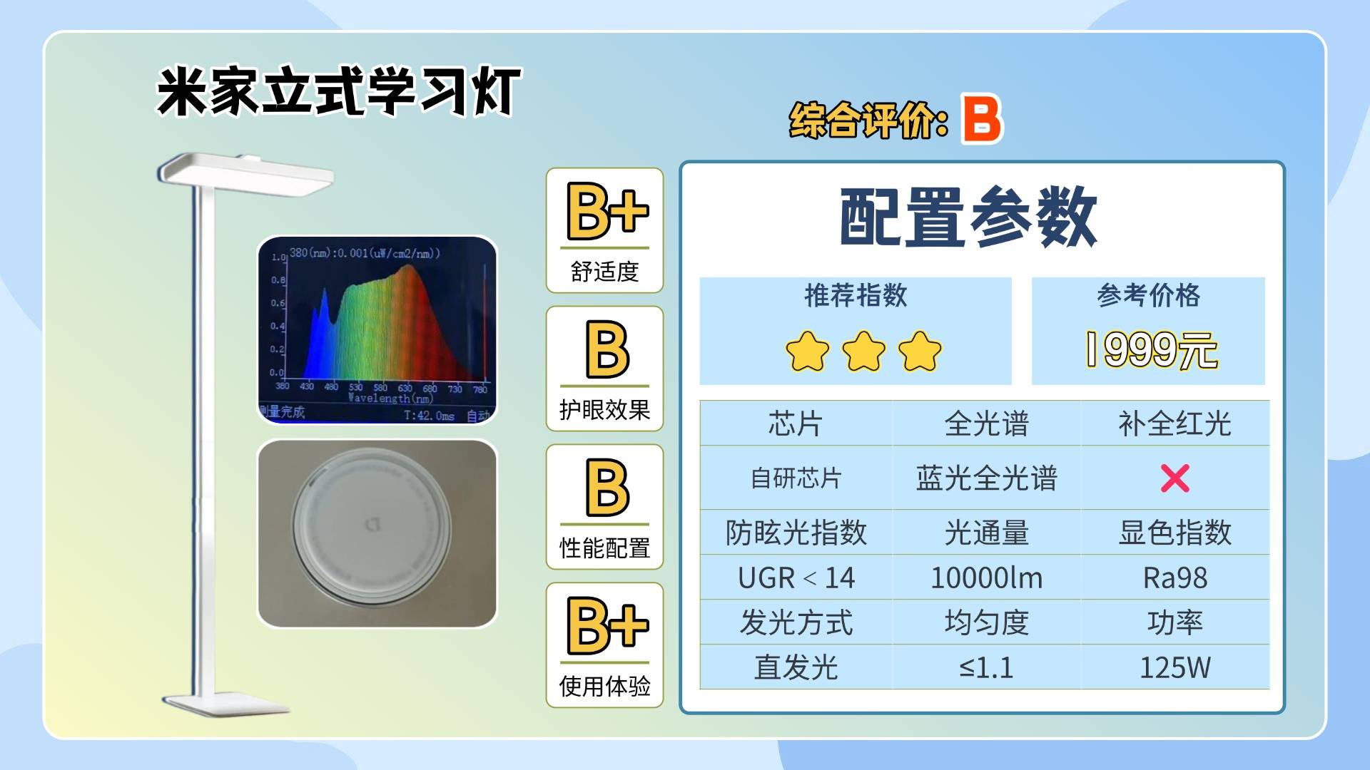 什么牌子的大路灯护眼好一点?米家为入门级的全光谱护眼大路灯,从实测数据来看,它的蓝光控制表现并不算理想,蓝光峰值约在0.7左右,光谱连续性偏弱,同时缺乏红光补充,对于护眼来说,这款不是最佳的选择,但对于日常照明,米家采用矩形发光面设计整灯光通量仍能维持在约10000lm左右,基础亮度尚可,且灯头前伸并支持约90°的转轴调节,不过需要注意的是,它采用的是直射式出光方案,实际使用时光线指向性较强,容易产生轻微刺眼和眩光感。