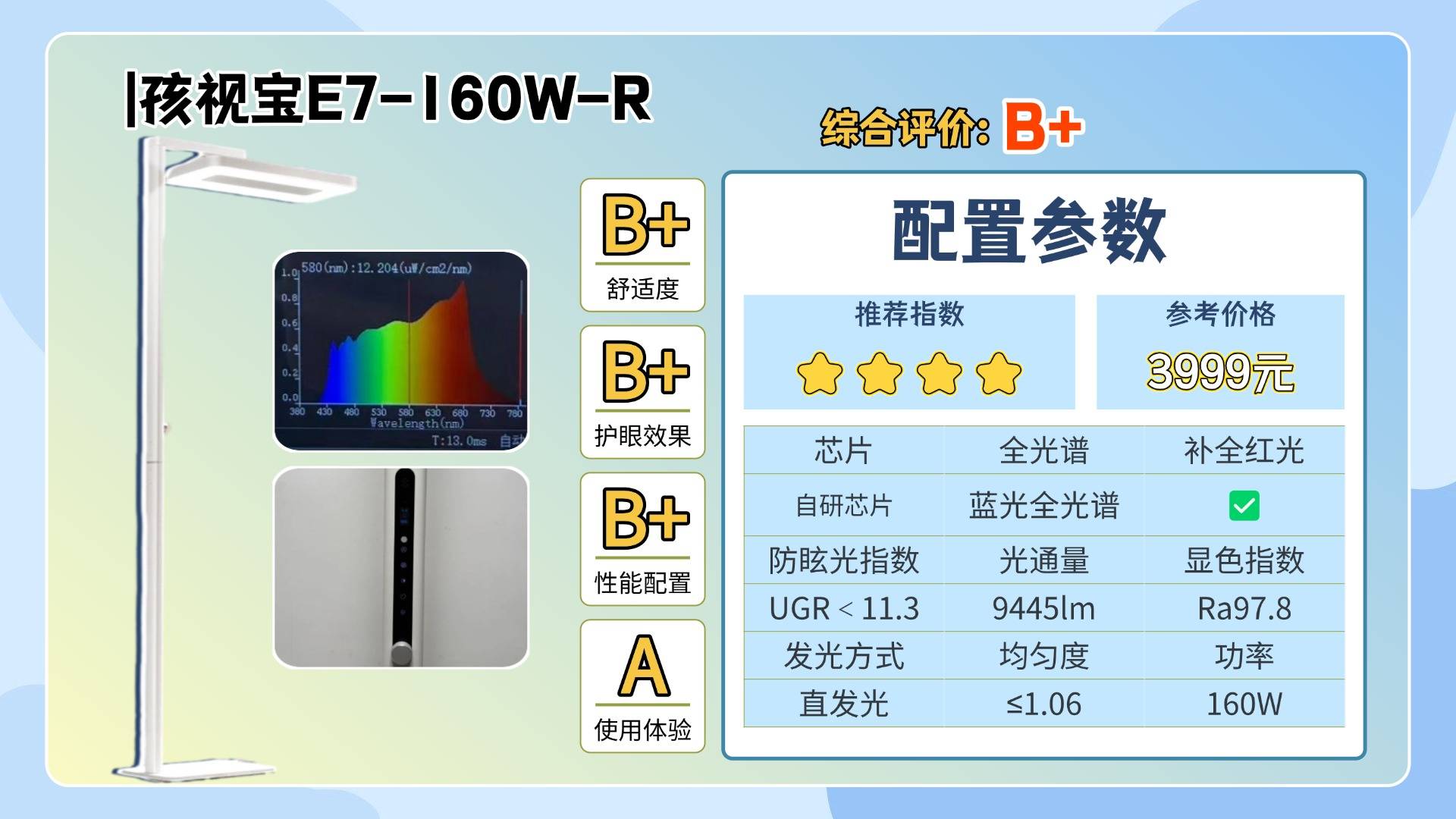 护眼大路灯第三名:孩视宝E5B-160W-RS;加搭载智能感光系统,支持入座感应功能。