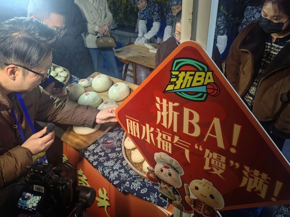 2月1日傍晚,丽水体育中心体育场浙BA总决赛门口,缙云南乡馒头摊位人头攒动。来自缙云的非遗大源南乡馒头与青田石雕在此有了一场“双向奔赴”。通过青田石雕雕成刻章,在大源馒头上印有“浙BA”“杭丽一家亲”“活力丽水”“江南秘境”等字样,浙BA非遗“联名款”馒头短短几个小时销售额破万,火爆全场。