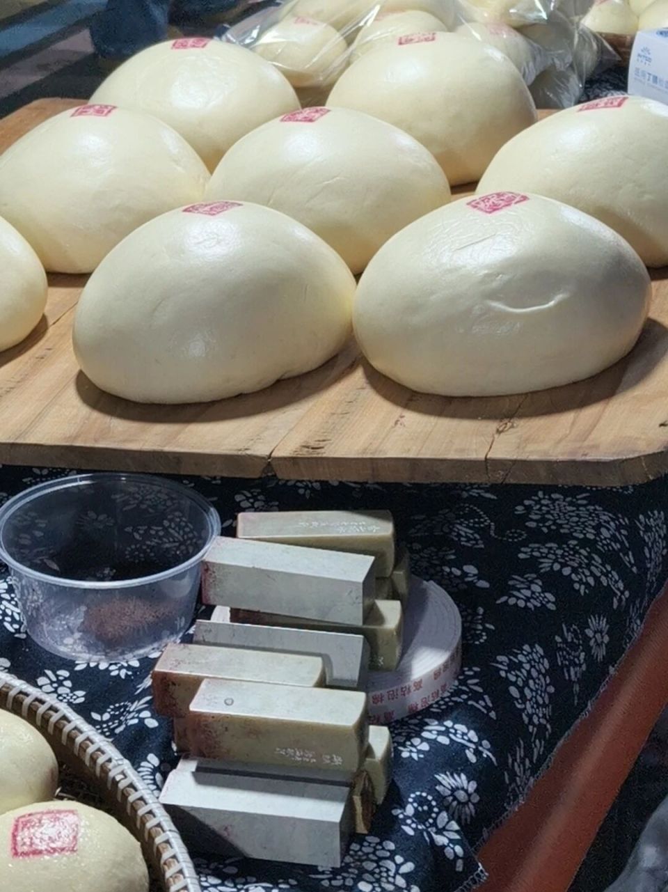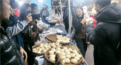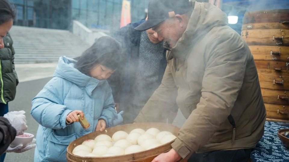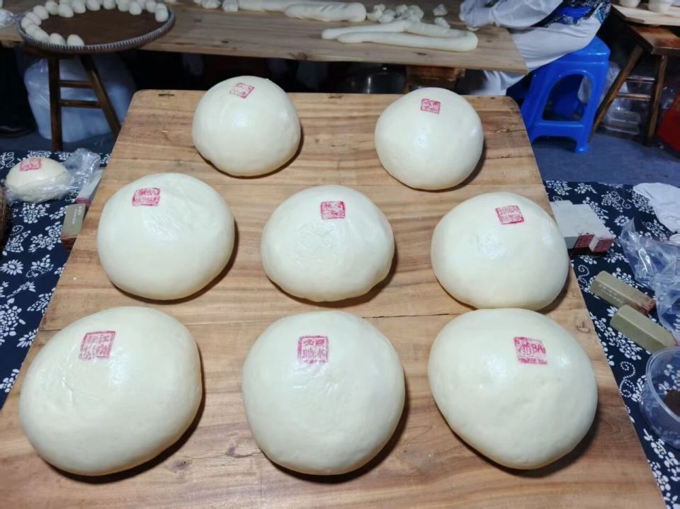 作为缙云非遗技艺的代表,大源馒头的登场本身就是一场非遗魅力的生动展演。其制作遵循千年传统工艺,以大米熬粥为基,按祖传比例加入老面“酵娘”与酒曲,经两三天自然发酵出微酸香气。取发酵水揉面,一夜发酵后塑形,再经二次发酵蒸熟。每一个馒头都凝聚着“老面发酵”的智慧与“手工揉制”的温度,蒸熟后麦香扑鼻、弹性十足、嚼之香甜,更延续着腊月二十五“馒头日”的民俗传统——出笼时“点红”的仪式感,既蕴藏着宋代胡则先贤“丹心守清白”的历史故事,也承载着大源人对美好生活的期许。