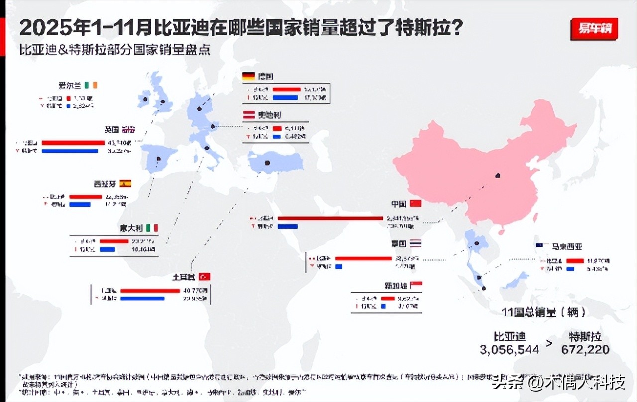 今年比亚迪在海外市场表现超给力,11月在巴西、土耳其、意大利等国拿下新能源汽车销量第一,新加坡等国更是全品牌销冠,多国销冠全面超越!同时还在不少国家和地区销量稳居前列,值得一提的是在中、英、德等11个核心市场,实现了对特斯拉销量的全面超越!