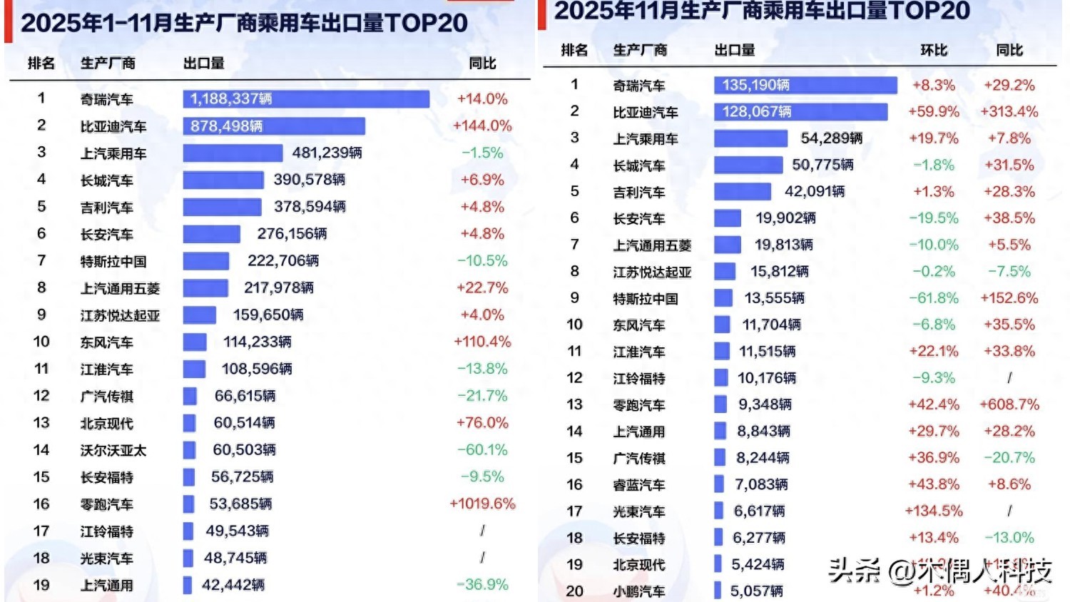 比亚迪出海成绩越来越亮眼!今年11月,比亚迪乘用车出口量12.8万台,同比增长313.4%。今年1到11月累计出口87.8万台,比去年同期增涨了 144%,甚至都超过2024年全年出口量的两倍了,妥妥的中国车企出口增速佼佼者!