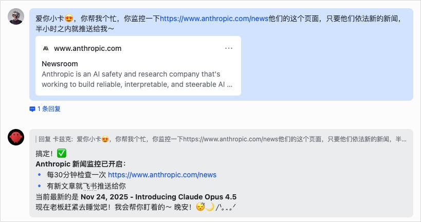 搞定。就...当这种订阅变得简单无比的时候,我们为什么需要那些其他的付费的方式呢?不只是定时,还可以做监控,比如,Claude 5不是吵的沸沸扬扬要发了吗。那我们就可以让小卡,监控一下Anthropic的博客。只要一更新,就立刻推送给我。