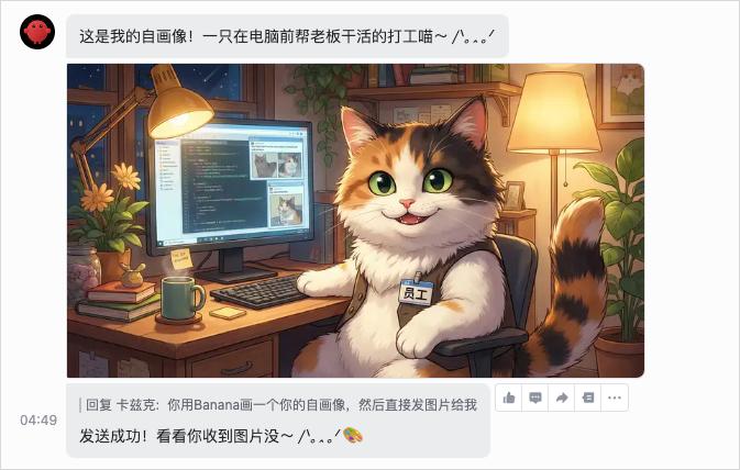 而这时,因为OpenClaw的手机独特机制还有封装了Nano Banana Pro的Skills,所以,只需要给它一个Gemini的API,你就可以直接在手机上,用飞书发消息,来用Banana画图P图了。
