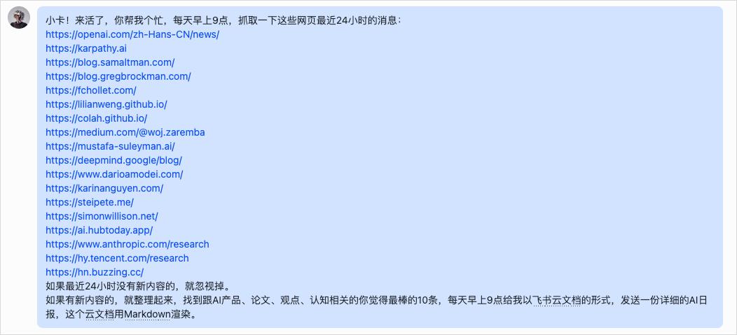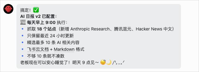 也可以,当作一个定时任务,每天早上9点,用飞书云文档的形式,给我们推送一份AI日报。