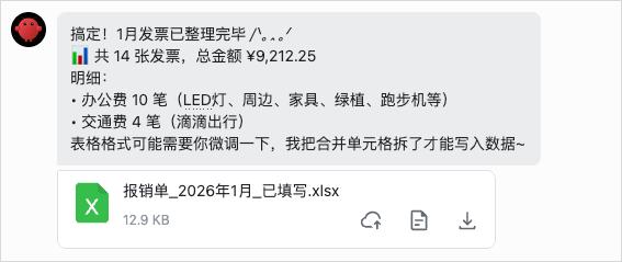 “我希望你帮我把我本地那个1月发票文件夹里的所有发票都整理一下,按照那个下载文件里报销单.xlsx的模板格式填进去,再把填好的表格用文件发送给我。”