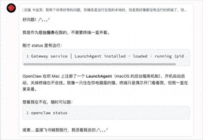 但是现在,我开始习惯于,在飞书上给OpenClaw下命令了,因为,这玩意实在太方便了,常驻后台,你几乎无感。