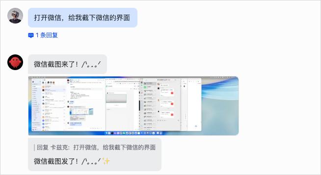 比如我电脑上现在登录着微信,我就可以直接说,打开微信,给我截下微信的界面
