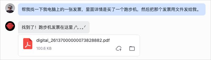 “帮我找一下我电脑上的一张发票,里面详情是买了一个跑步机,然后把那个发票用文件发给我。”