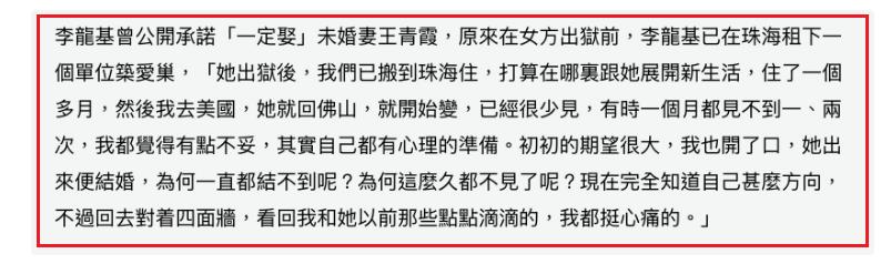 为了让这段爱情早日有结果,李龙基特意跑到内地珠海租了一个房子,当成两人的爱巢。待王青霞出狱后,李龙基带着女友返回珠海居住,打算在那边展开全新的生活。