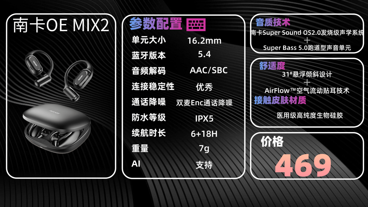 为了带来极致的使用体验,南卡OE Mix2不仅搭载了高定制蓝牙5.4芯片SOC,性能更加强劲,抗干扰性更出色,实现了秒级连接和响应。还有着更高的数据传输速度、更低的能耗、更低的通信延迟。同时还配备了6+18H的长续航,双麦克风通话降噪、IPX5防水以及AI智能等多项功能,这个配置哪怕是放在千元机型上也是非常罕见的,可谓是诚意满满,性价比非常高!