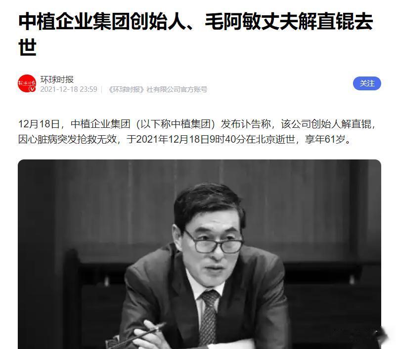 信息来源:中植企业集团创始人、毛阿敏丈夫解直锟去世