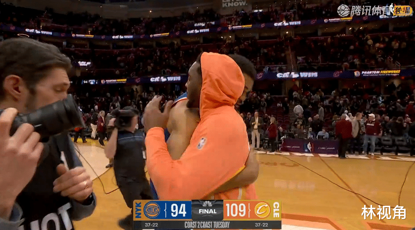 比赛结束,米切尔走入场内,和下场的队友击掌庆祝,又一把抱住走过来的唐斯,与其拥抱致意,两队球员赛后很友好,在场上又是拥抱又是交谈。