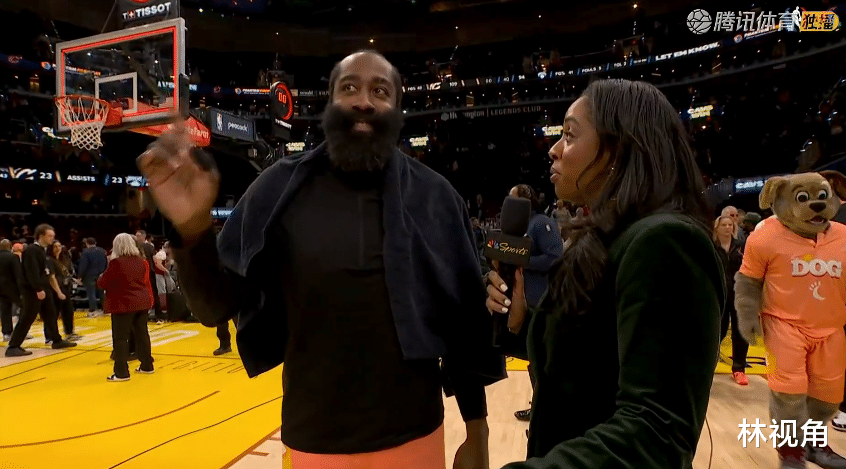 哈登来到场边,接受记者采访,看其脸上笑容,哈登在骑士确实是挺开心啊。