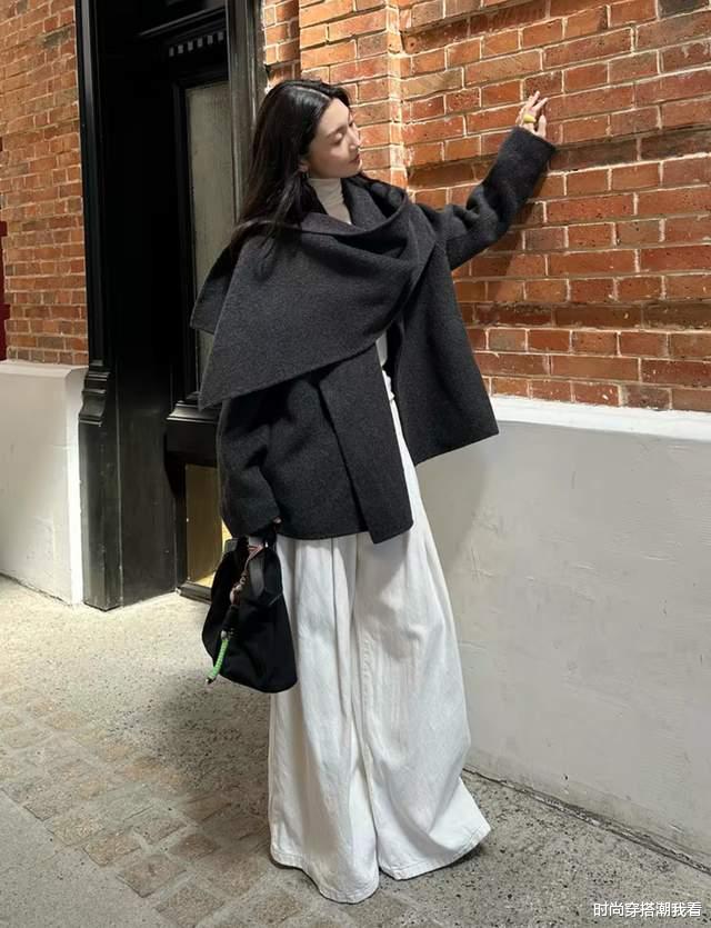 以前总觉得阔腿裤是春夏的专属,冬天穿会灌风。但现在的阔腿裤材质越来越多样,羊毛、针织、呢料,甚至加绒的都有,既保留了飘逸感,又兼顾了保暖性。