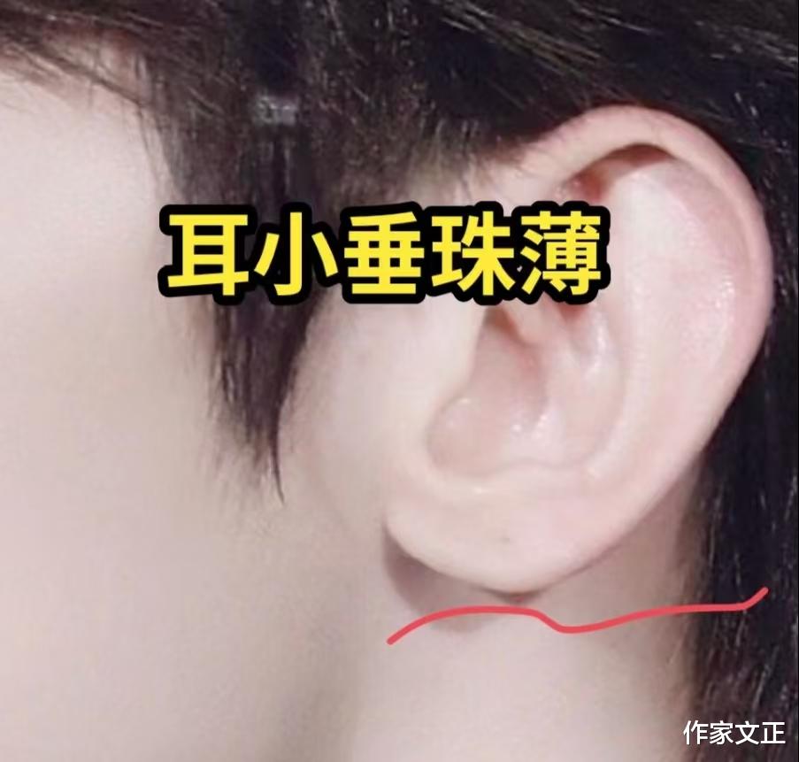 耳朵肉极薄又小,轮廓分明,耳垂很小,没有耳垂的肾气不足,对物质生活依赖严重,永没有知足的心,金钱与物质胜过一切;老年运气不佳,或者身体病弱,或者儿女不能尽孝,同时也代表父母身体不好,需及早孝敬老人,性格上,重精神获得,想象力丰富,是典型的性情中人。现实中有点漠不关心,好幻想,做事缺少计划性,往往凭一时的情绪处事。若是整只耳朵长得小而肉又薄更没有耳垂的人,可能会在浪费或是失败时破财;所以要特加留心,应培养自己对金钱的概念,提高理财能力。